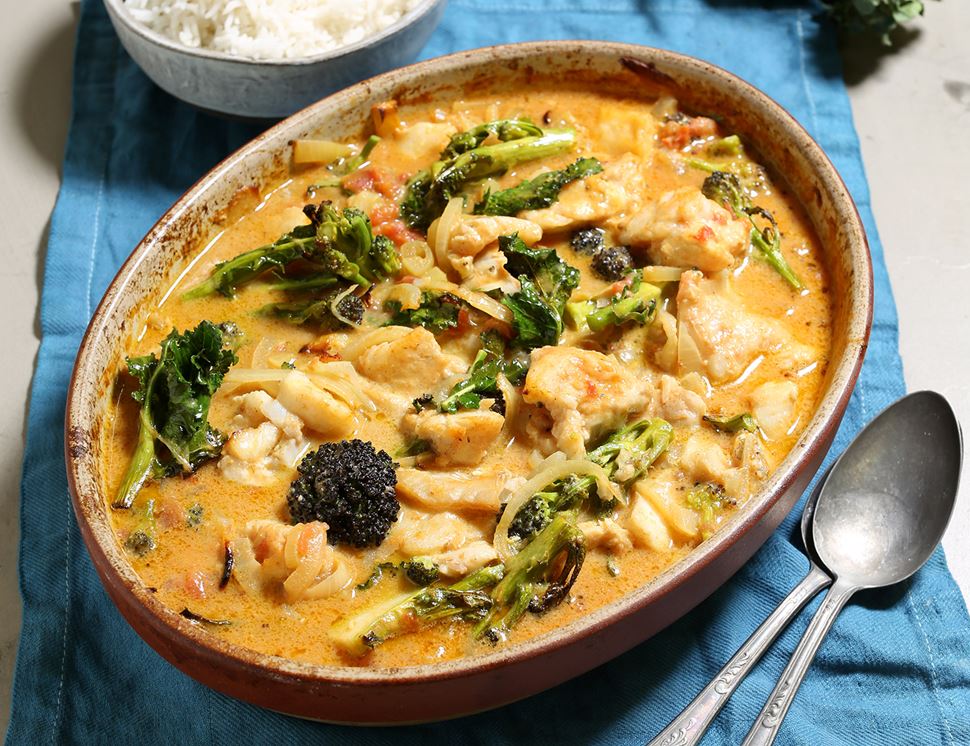 When the curry has baked for 40 mins in total, remove it from the oven. Add the broccoli and the fish pie mix to the tin. Fold together and slide back into the oven for 15 mins, till the fish and broccoli are cooked through. The broccoli should be just tender and the fish will be opaque and flake easily when pressed with a fork.