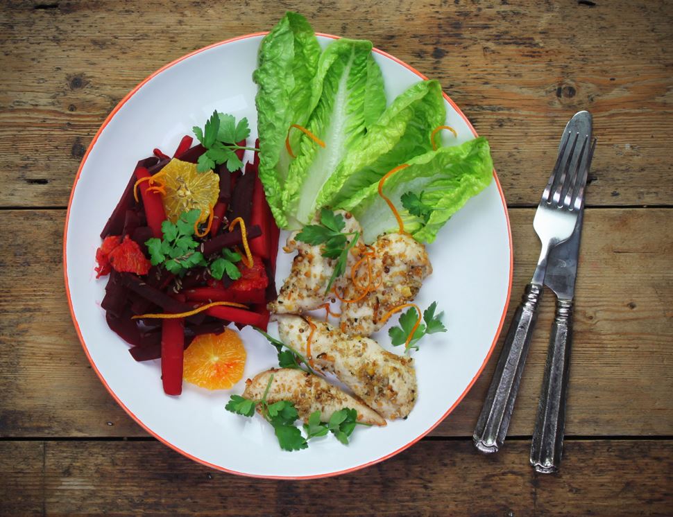 Separate the romaine leaves and divide between a couple of plates. Spoon the carrot and beetroot salad onto the plates and add the chicken pieces. Scatter over the parsley leaves to serve.