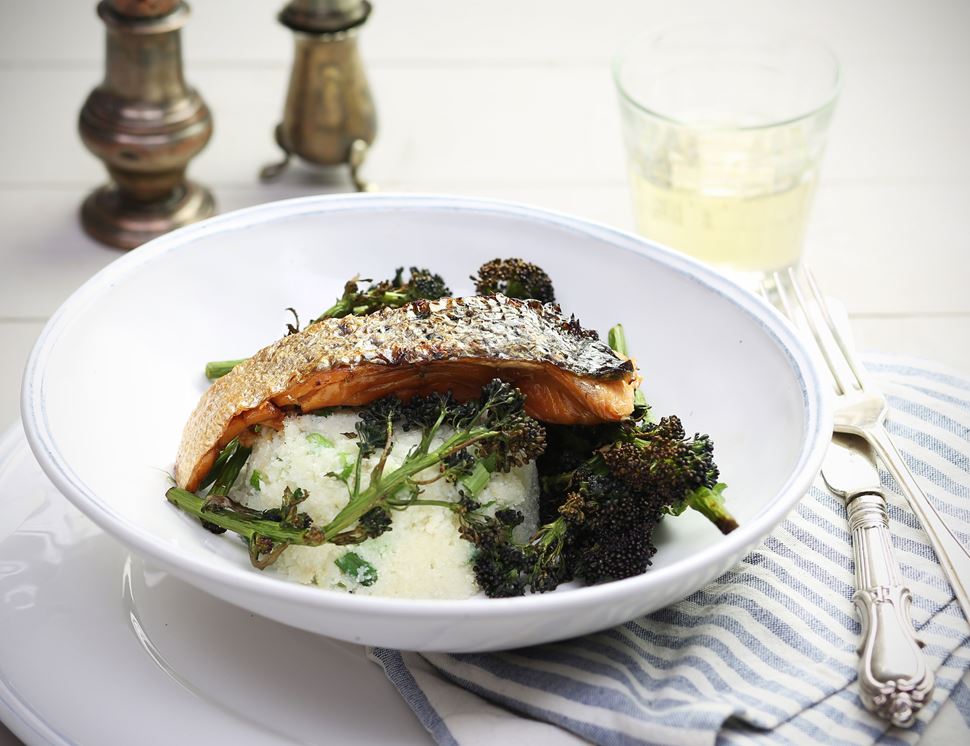 Chop any big pieces of purple sprouting broccoli into smaller florets so they’re all roughly the same size. Arrange them around the salmon.