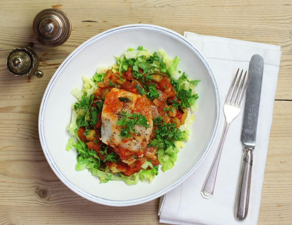 Try the tomato sauce and season to taste. Serve the cod and tomato sauce with the cabbage ribbons, sprinkled with the chopped parsley leaves.