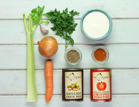Drain and rinse the chickpeas. Stir them into the pan with the chopped tomatoes. Fill the tomato can with warm water (around 400 ml) and add that to the pan too. Pop a lid on the pan.