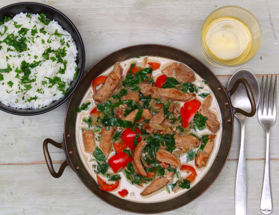 Pour in the coconut milk with 300ml hot water from the kettle. Bring to the boil. Turn the heat down. Pop on a lid. Simmer over a lowish heat for 20-25 mins. Stir now and then till the pork is tender.