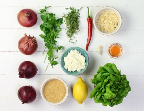 Spoon the couscous and ewe’s cheese mix into the roast onions, pressing in firmly. Spoon the remaining ewe’s cheese over the top of the onions. Season. Bake for 15 mins till the cheese is melting and golden at the edges.