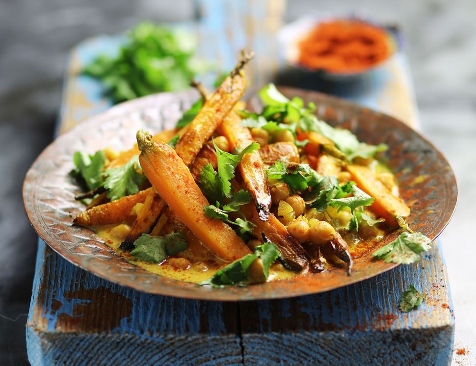 Take the pan off the heat. Stir in the yogurt mix 1 tbsp at a time (the residual heat will cook the egg). Add the roast carrots to the pan. Taste and adjust the seasoning.