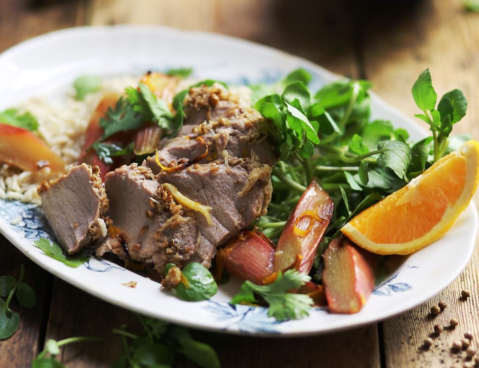 Roughly chop the coriander. Slice the pork and serve it with the rhubarb, rice and watercress. Scatter over the chopped coriander and serve with the orange wedges for squeezing.