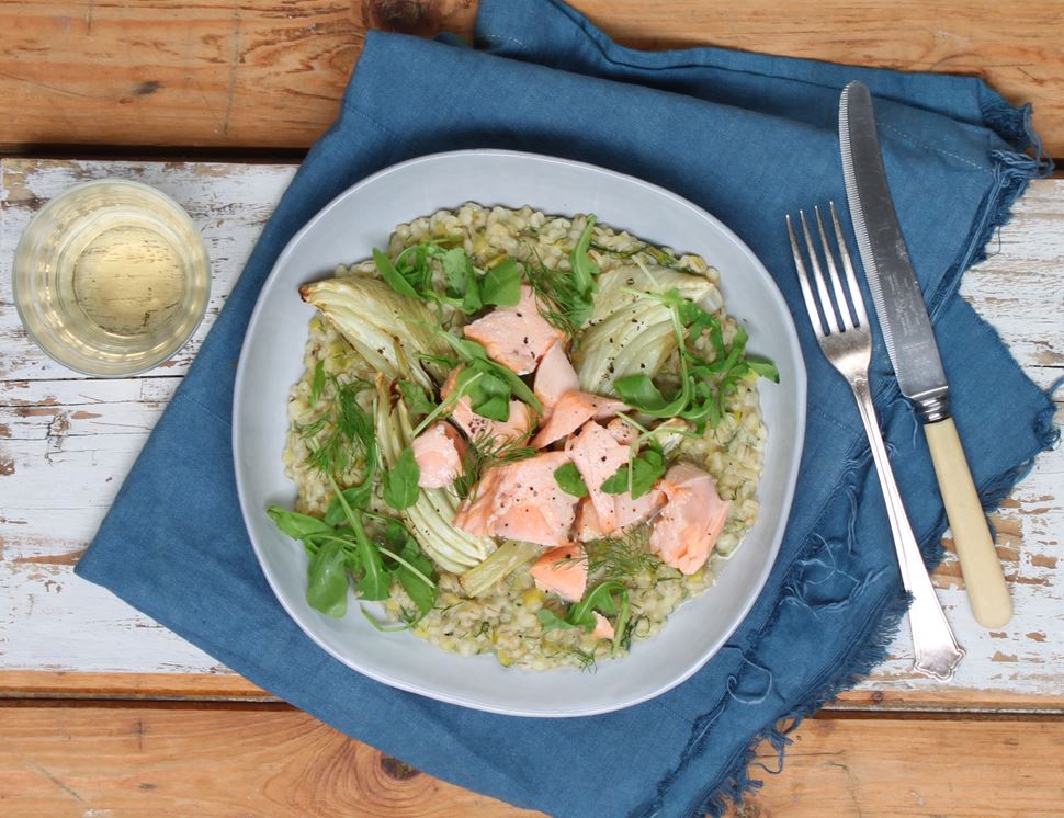If you don’t want to slowly cook your pearl barley, you can simmer it in the veg stock all in one go for 30-40 mins till it’s cooked through. It won’t be as creamy but will still be delicious served with the roast salmon.