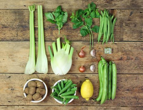 Cut the French beans into thirds, trimming the ends. Pod the broad beans and peas. Add them all to the pan. Cook for 2 mins without the lid on.