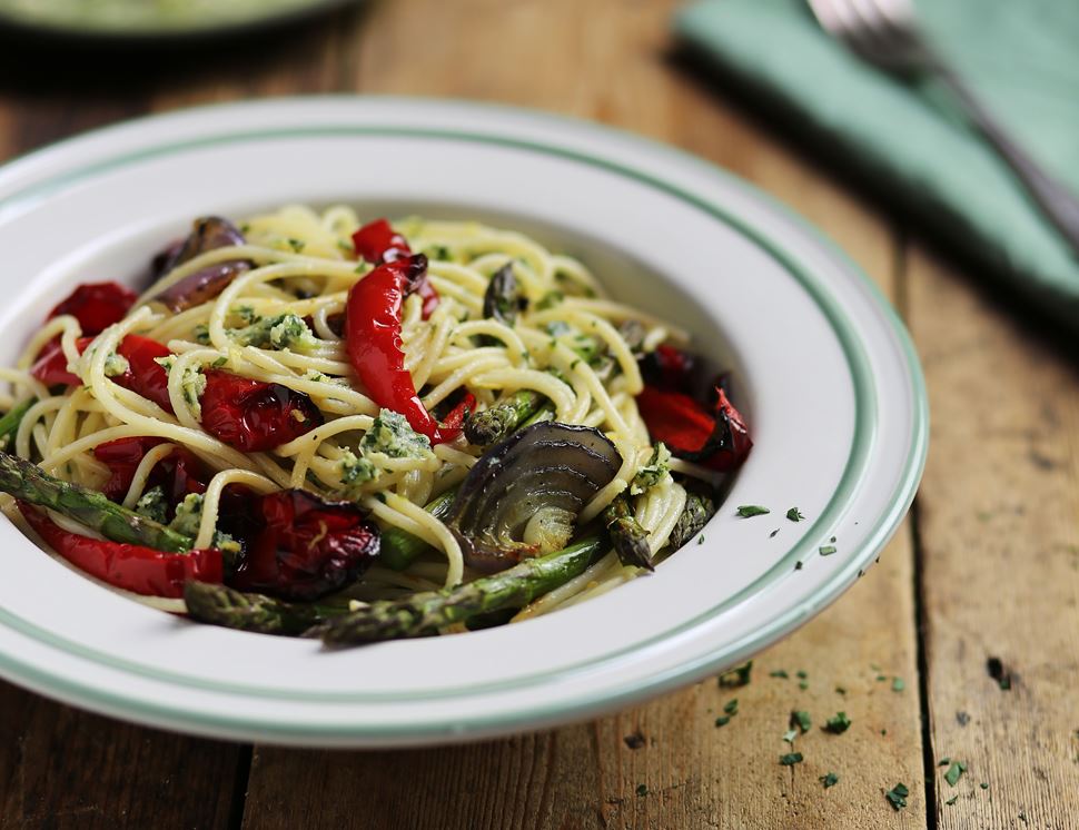 Divide the spaghetti between 2 plates. Top with the roast peppers, onion and asparagus. Scatter over the parsley leaves and serve with wedges of lemon and the remaining Cheddar for grating.