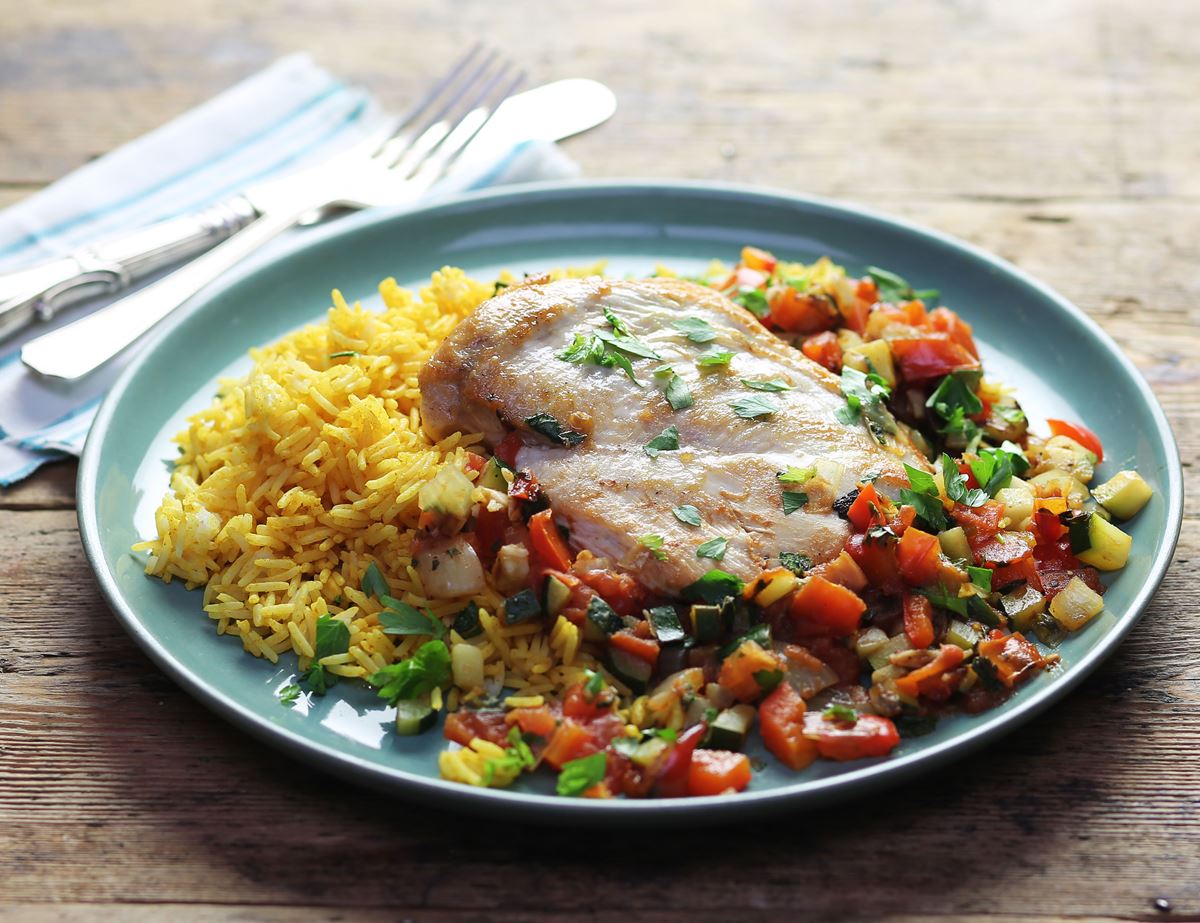 High welfare chicken is cooked with a marvellous Mediterranean mix of courgette, tomatoes and red pepper. Serve with golden rice for a Spanish supper to savour.