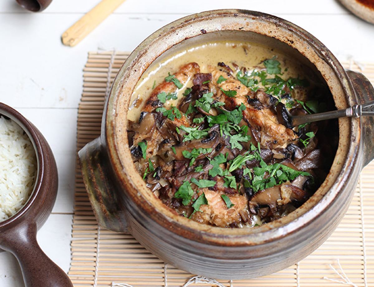 4. Tip the mushroom mix into a lidded casserole dish once they’re beautifully cooked.