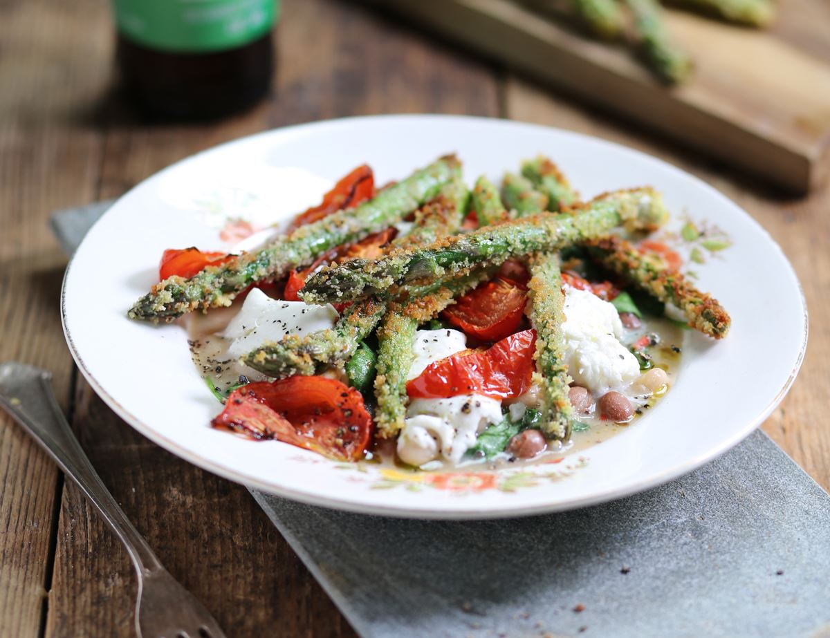Seasonal asparagus rolled in breadcrumbs and fried in olive oil till crisp and golden, then served on top bowls of a Roman-inspired mix of cannellini and borlotti beans, finished with rich baked tomatoes and torn mozzarella.