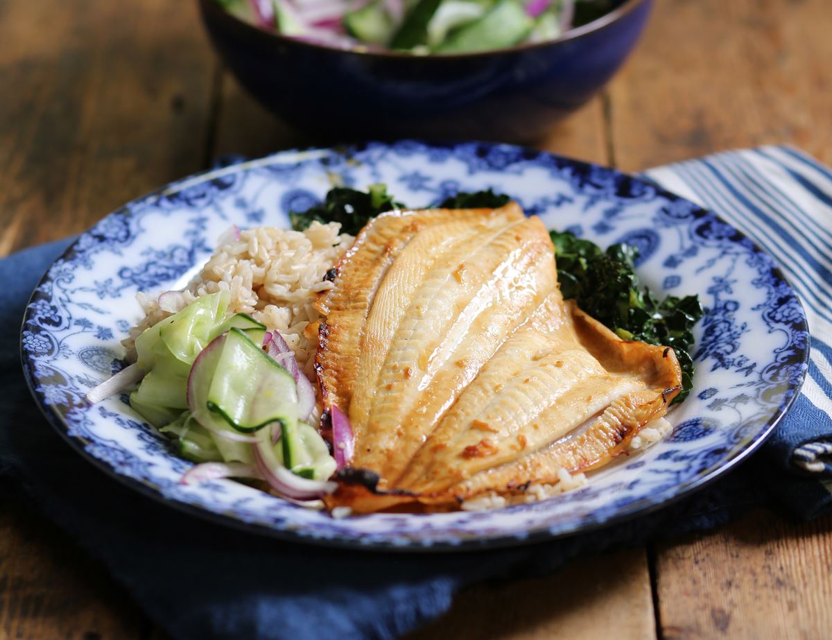 4. Heat your grill to high. Pop the plaice fillets on a grill pan or baking tray that’s lined with foil, skinside up (keep the marinade). Grill for 4-5 mins till the plaice is cooked through and flakes easily when pressed with a fork. You don’t need to turn the fillets over – they’ll cook all the way through.