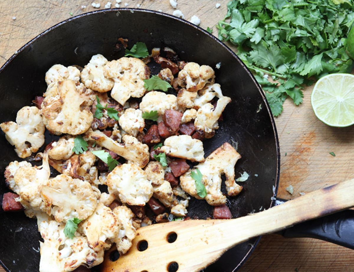 This is a brilliant way to use up your cauliflower. Try it with a little chorizo thrown in and treat it like a Spanish style tapa dish. Gorgeous with fish and a few other jazzed up veg sides.