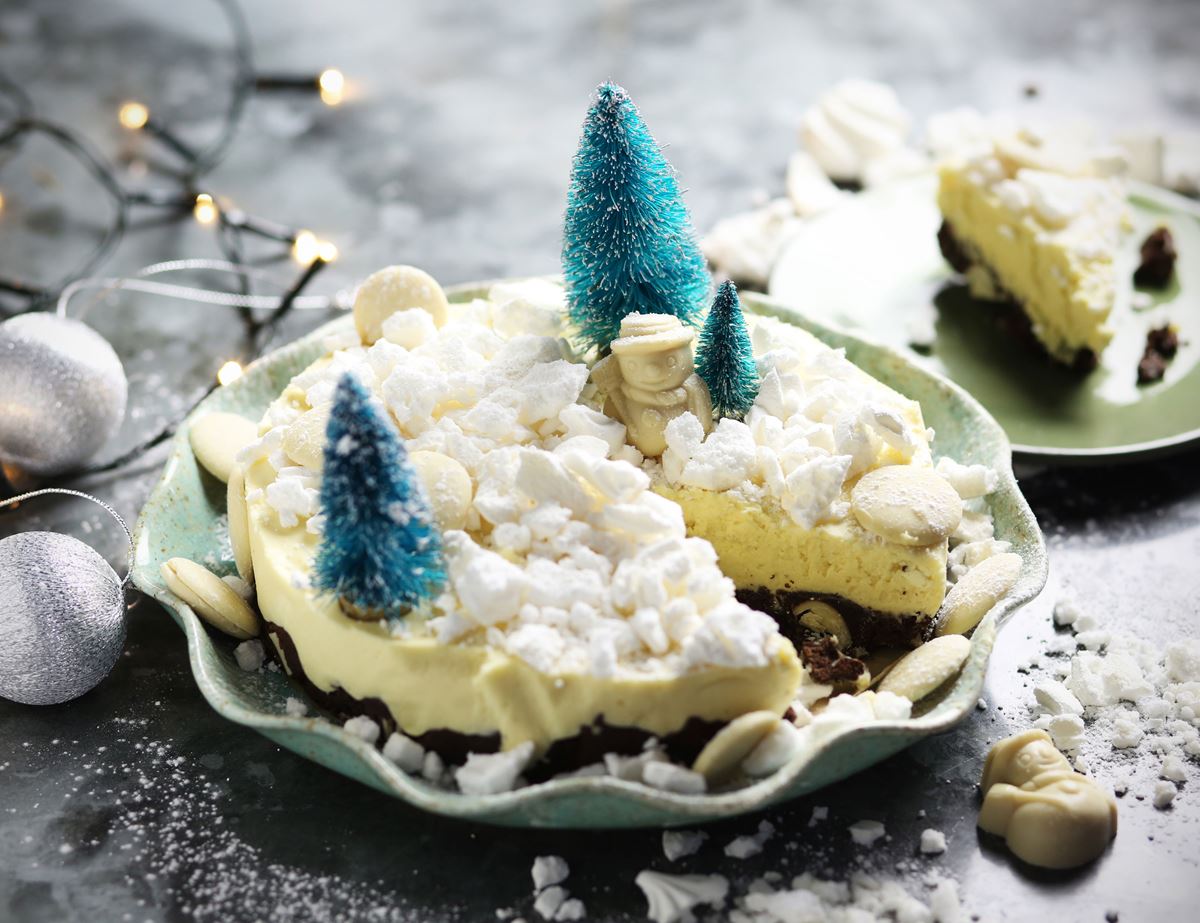 An indulgently delicious three ingredient frozen torte that can be whipped up in advance. Decorate with white chocolate snowmen, crushed meringue and homemade truffles for a Christmas showstopper.