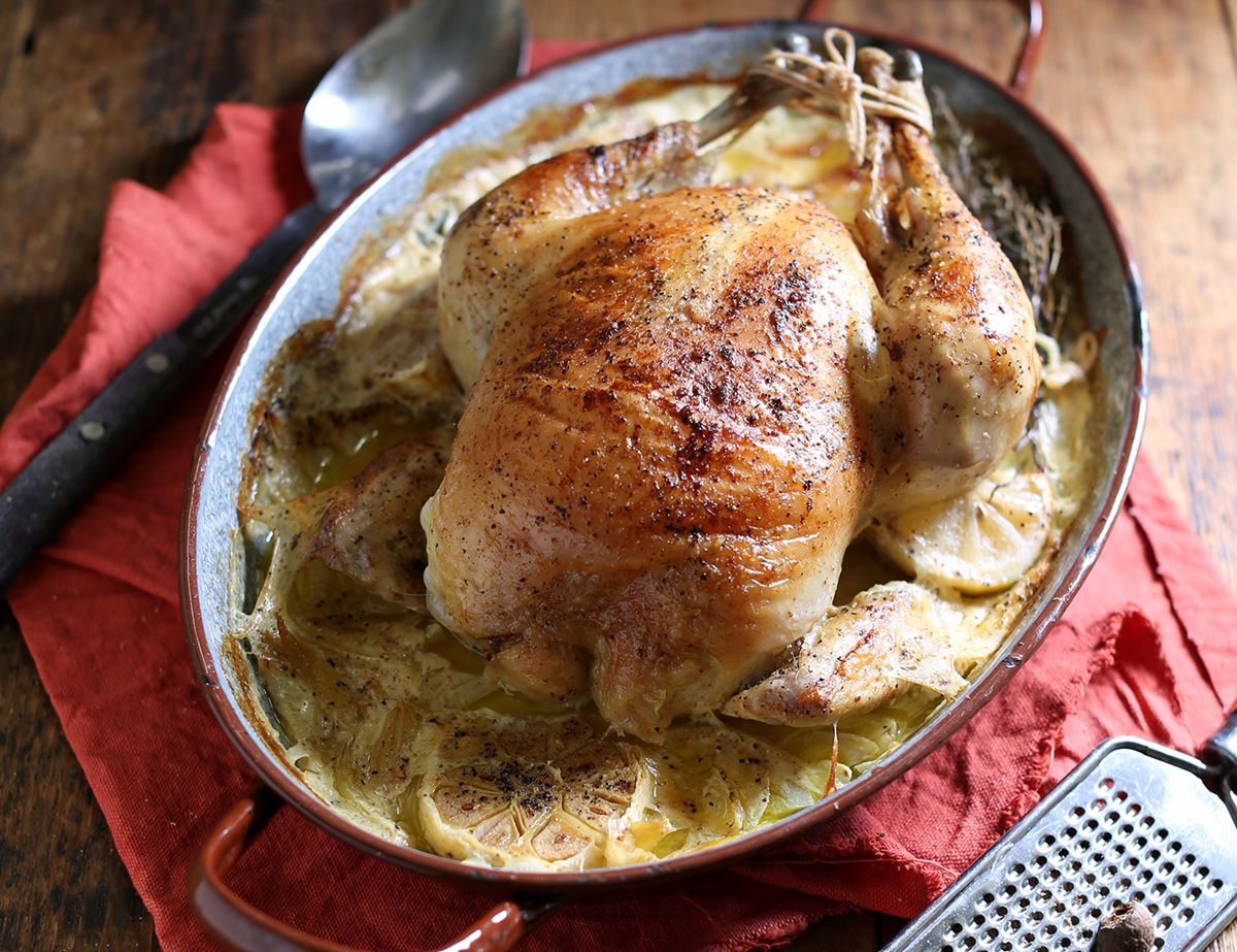 Roasting chicken in a rich milk bath makes it meltingly succulent. We’ve added fresh thyme, nutmeg, a squeeze of lemon and a whole garlic bulb to the tin to make a fragrant, flavoursome, Italian-inspired sauce for this week’s whole roast bird.