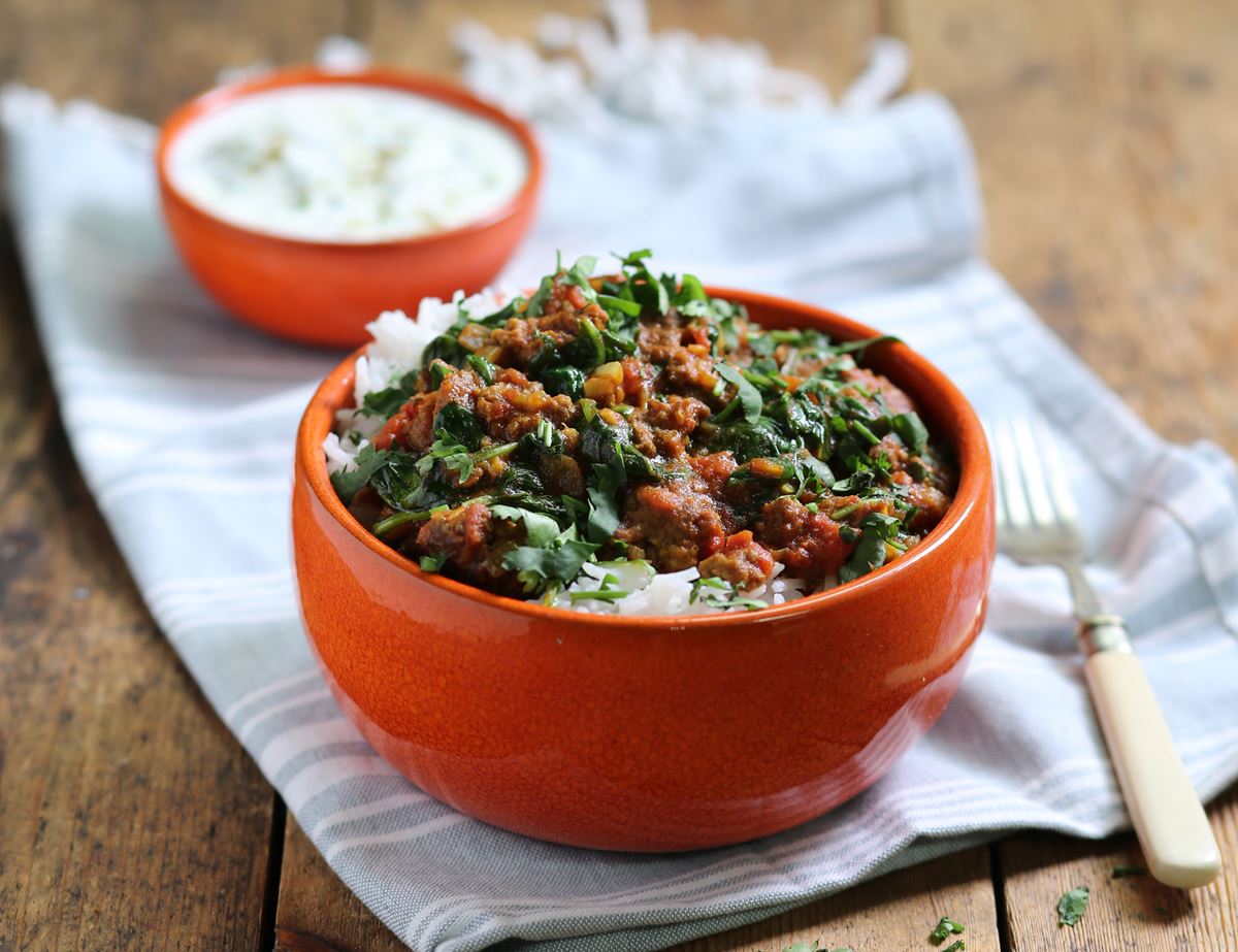 8. Stir the spinach into the lamb keema. Simmer, uncovered, for 2-3 mins to just wilt the spinach. Taste the keema and season if you think it needs it. Serve with the rice and cucumber raita, garnished with the coriander leaves.