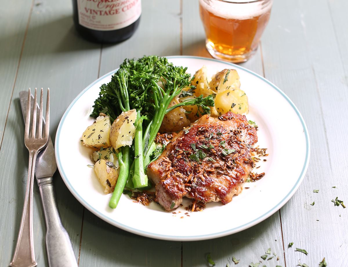 Succulent pan-fried pork steaks snuggle up on a plate with a seasonal side of minted new potatoes and Tenderstem® broccoli, and are served drizzled in a sizzling garlic and caraway seed butter sauce.