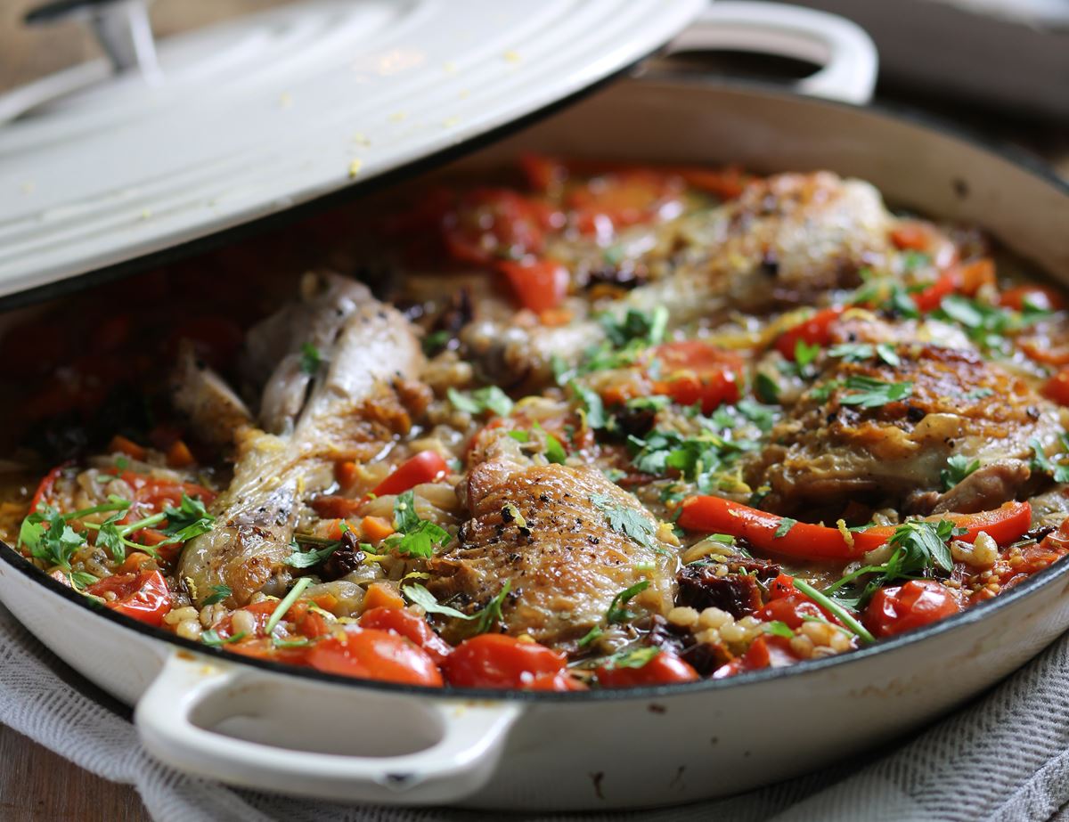 Add a splash of French sunshine to an autumn evening by rustling up this fabulous chicken stew. Tender chicken thighs and drumsticks cooked with nutty pearl barley, cherry tomatoes, sun dried tomatoes and rosemary. A scattering of fresh parsley and lemon zest at the end lifts the dish.