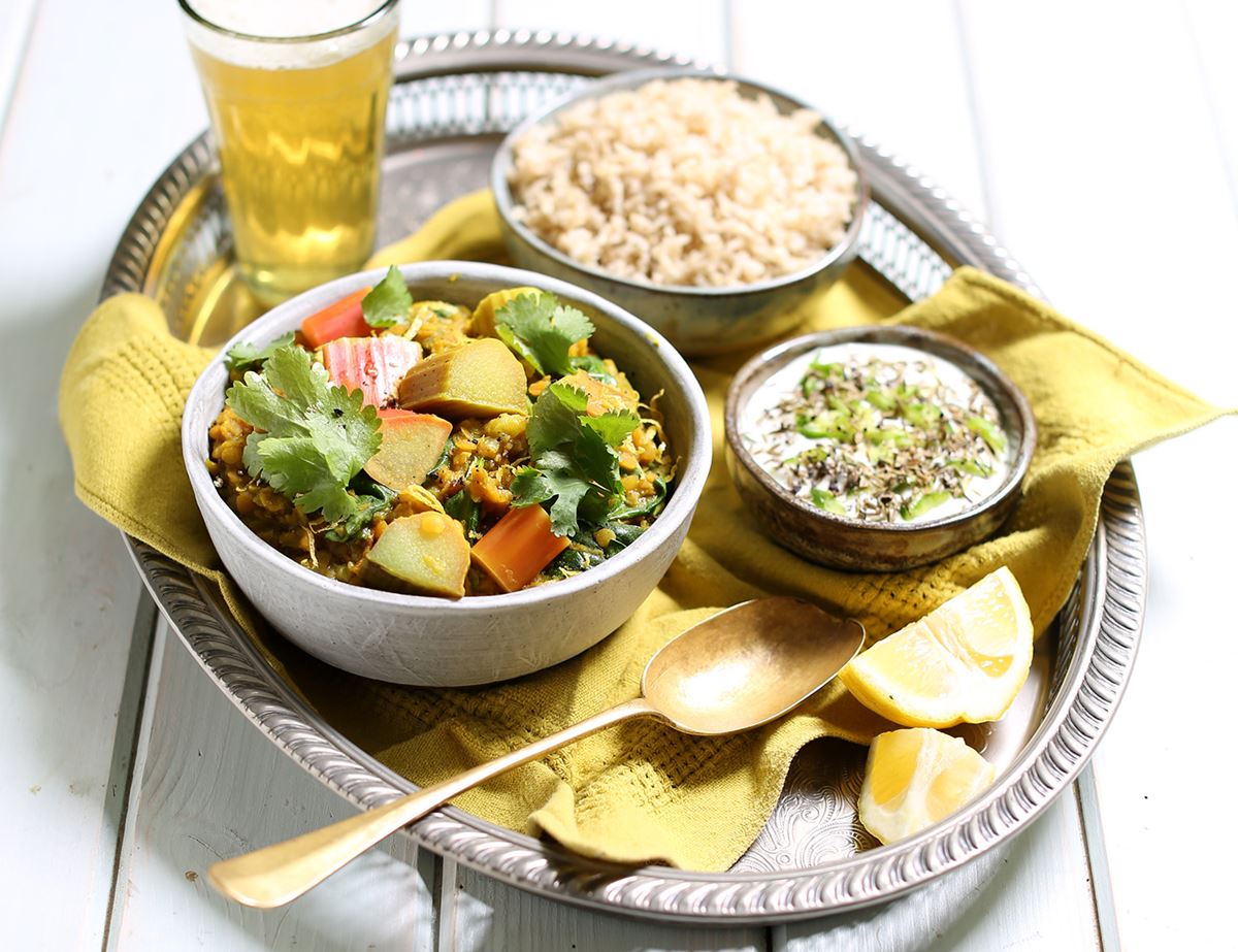 Few things sing spring as colourfully as rhubarb. Usually treated as a fruit, it’s actually a type of veg, and its sharpness adds refreshing tang to this seasonal curry made with creamy lentils and earthy turmeric.