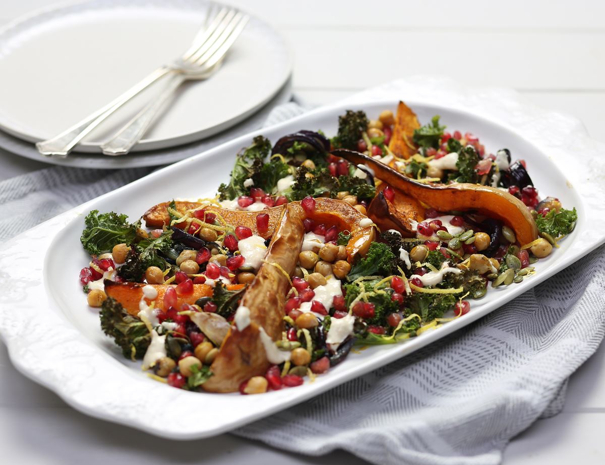 Tonight your plate is packed with colour and flavour. Spiced organic squash is mixed with crunchy kale and chickpeas, with a zingy lemon and tahini dressing.